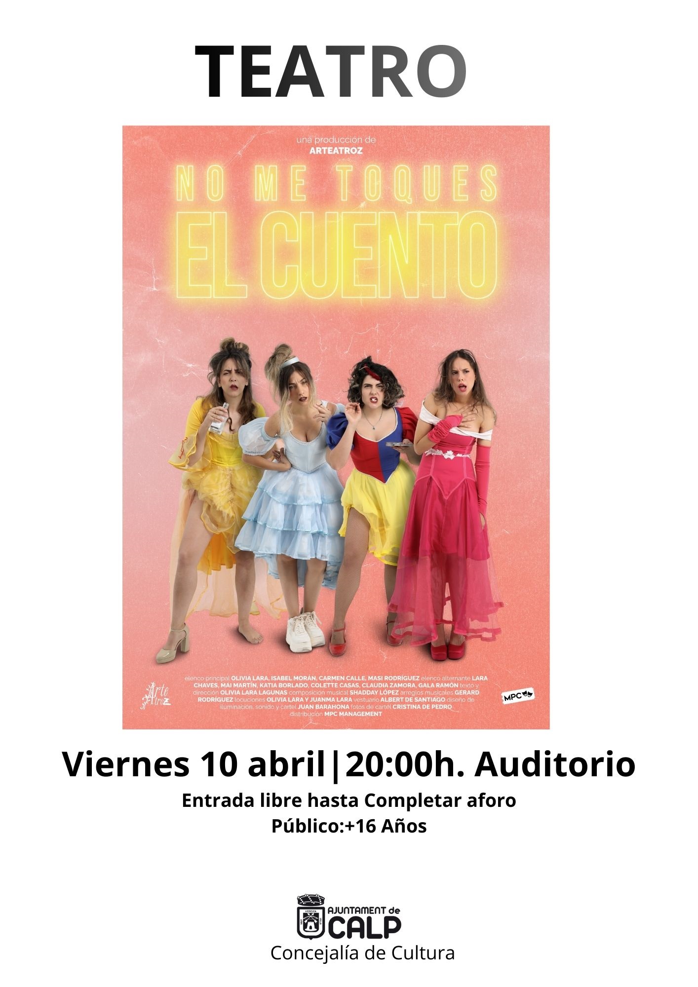 Kategorie Theater Datum Fr., 10/04/2026 Zeitpläne 20:00h Preis Freier Eintritt bis zur maximalen Kapazität, ab 16 Jahren Platz Auditorium, Kulturhaus Organisieren Stadtrat von Calp + Kulturministerium Verwandte Ereignisse MEDEA THEATER21/03/2026