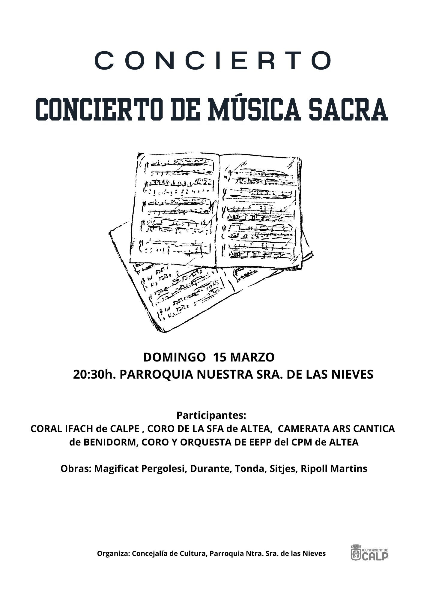Categoría Music Fechas Sun, 15/03/2026 Horarios 20:30h Lugar Parroquia Nta. Sra. de las Nieves Otra información Coral Ifach de Calpe, Coro de la SFA de Altea, Camerata Ars Cantica de Benidorm, Coro y Orquesta de EEPP del CPM de Altea. Related events THE NIGHT IS ON07/03/2026 I FESTIVAL INTERNACIONAL DE JAZZ& BLUES : TORONZO CANNON & BLUES BAND CHICAGO11/03/2026 ROYAL OPERA SIEGFRIED31/03/2026 DUO DI FALCO - SACCHI (soprano and harp)16/04/2026