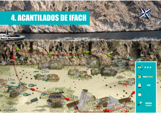 Nous nous dirigeons ensuite vers le mur, légèrement ouvert à la pointe (environ 45º) et nous perdons de la profondeur alors que le fond marin devient rocheux avec ses habitants typiques de poulpes, murènes, dorades... et il y a aussi de nombreuses étoiles de mer et gorgones jaunes. La pente ascendante se termine à la paroi du Rocher, à environ -17mts sur laquelle nous monterons petit à petit vers le point de départ, en observant les beaux contre-jours que les fissures qui le marquent, ainsi que l'abondance de porifères comme les éponges et les cnidaires comme l'anémone jaune encroûtante sur ses parois, pour finalement faire l'arrêt de sécurité et retourner au bateau.